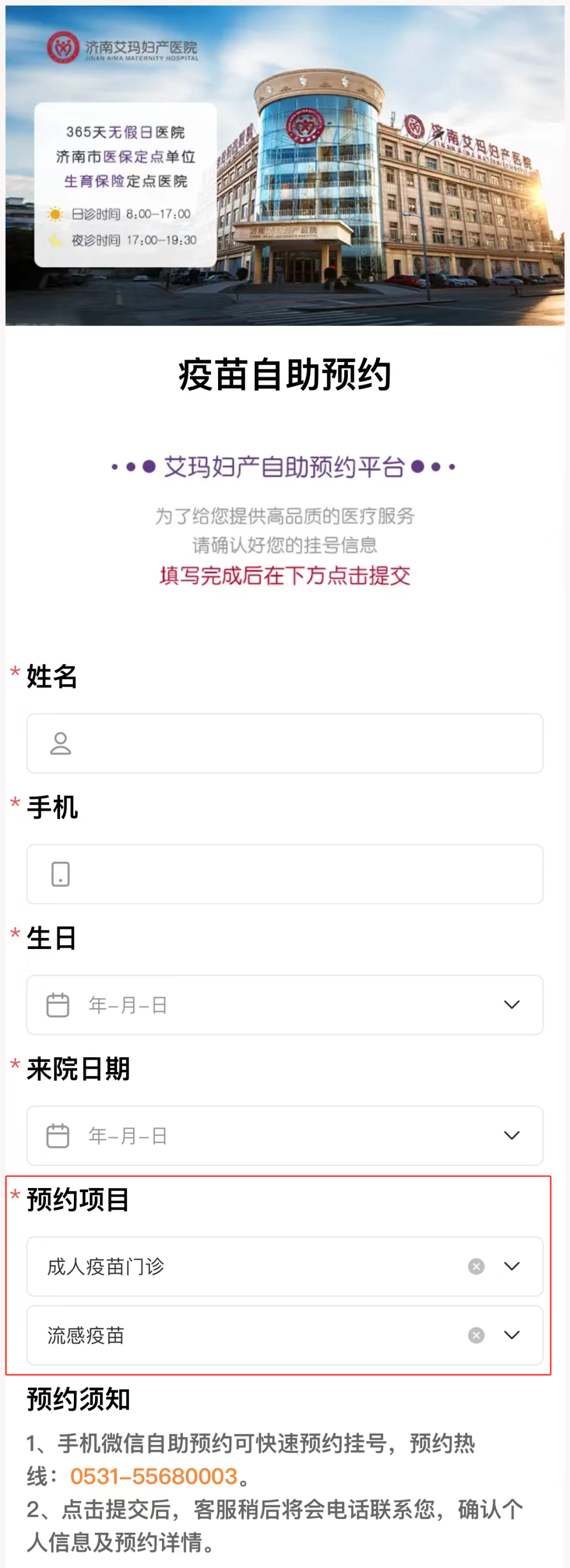 3、填写姓名电话和来院日期,在预约项目里选择“成人疫苗门诊”、以及需要预约的疫苗种类(我院是成人接种门诊,仅限18周岁以上的成年人接种);
