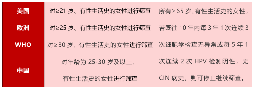 《中国子宫颈癌综合防控指南》(下称“指南”)对我国目前宫颈癌筛查策略给出了详细建议,指南给出了宫颈癌筛查的起始年龄和终止年龄,各国略有不同。