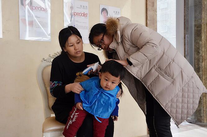给宝宝理发可是门技术活哦,艾玛特邀专业理发师为宝宝理发,对放心哦!