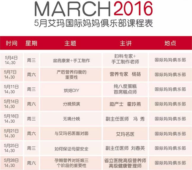 济南艾玛妈妈俱乐部5月份课程表览: