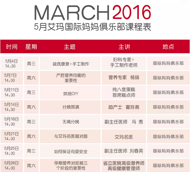 济南艾玛妈妈俱乐部5月份课程表览: