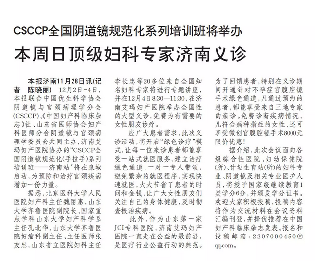 12月2日,“CSCCP全国阴道镜规范化(手拉手)系列培训班--济南站”将在济南艾玛妇产医院启动,为预防和治疗宫颈疾病增加份力量。