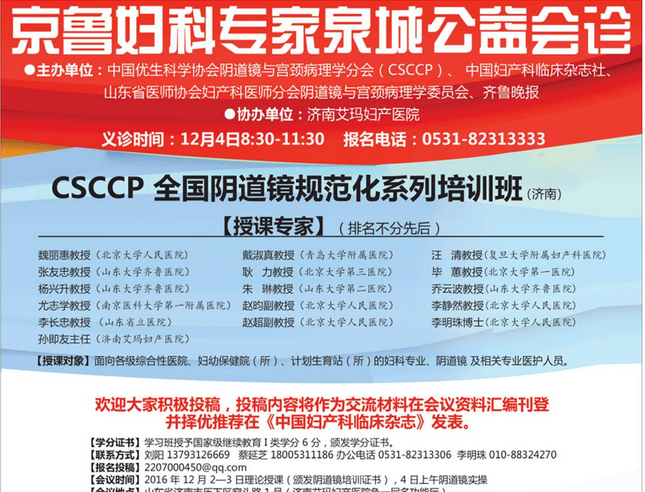 本次培训班为期3天,得到了全国阴道镜与宫颈病变及病理学相关专家学者的积极支持。北京大学人民医院妇产科主任魏丽惠教授,妇瘤科副主任、主任医师张友忠,山东省立医院妇科主任李长忠等20多位全国知名妇科专家,就妇科阴道镜、宫颈病变及病理学诊断新发展和新研究成果进行现场学术交流与答疑,并在济南艾玛妇产医院举办全国性的大型公益会诊,为有需要的女性朋友诊疗。