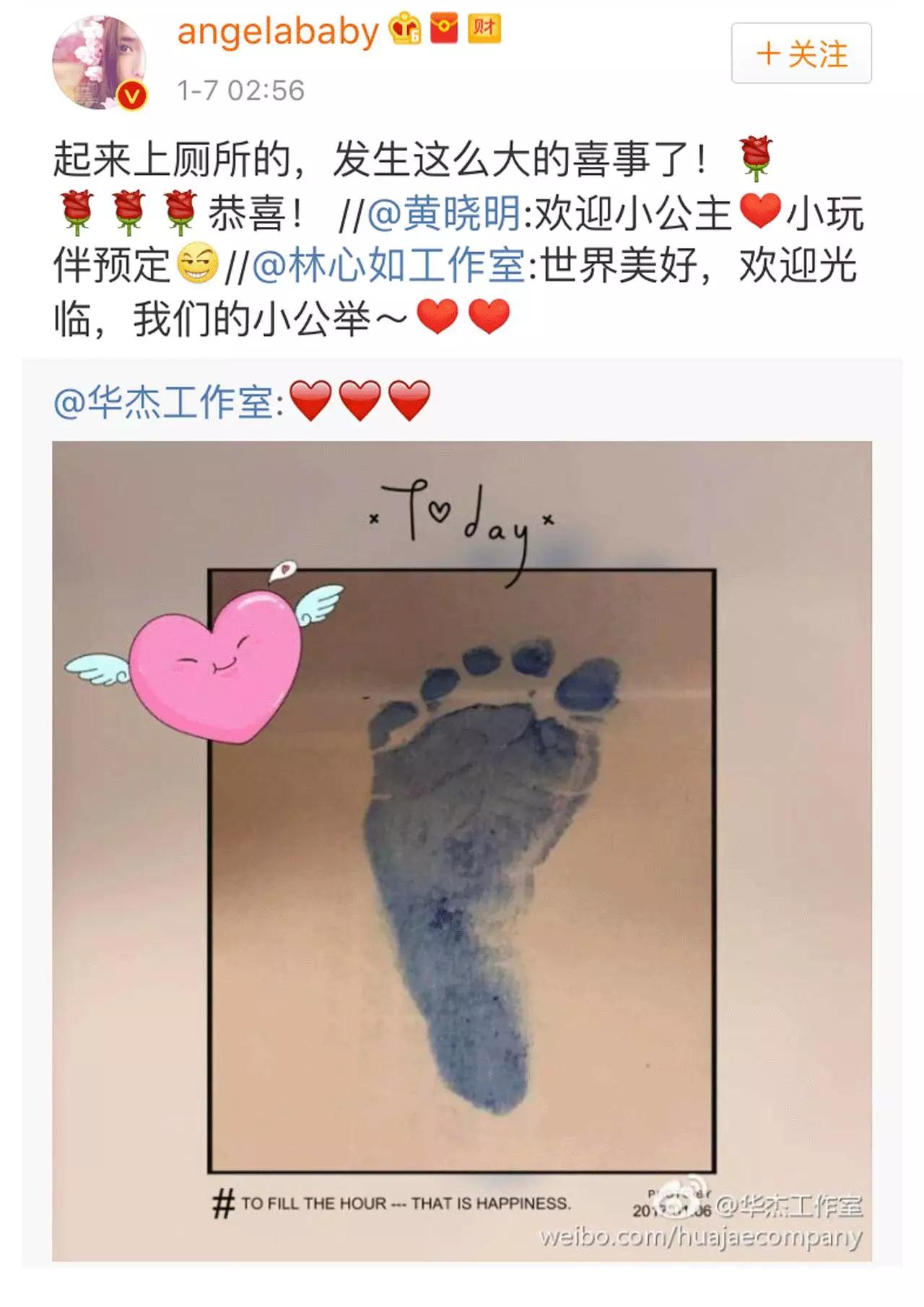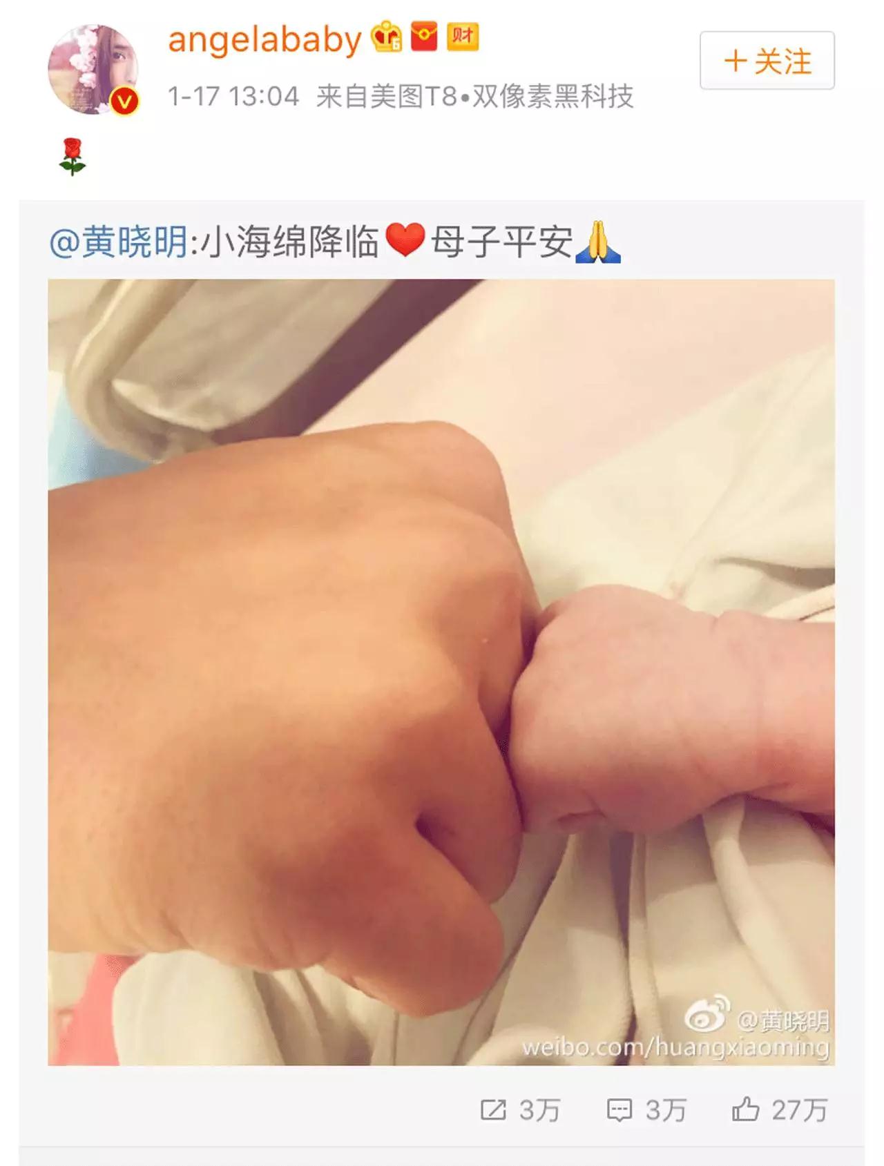今晨,黄晓明工作室官方微博分享了则好消息:Angelababy于香港顺产生子,黄晓明与家人直全程陪护。AH夫妇共同有了爱的美好延续,从此1+1=3,这大概就是幸福的模样吧......