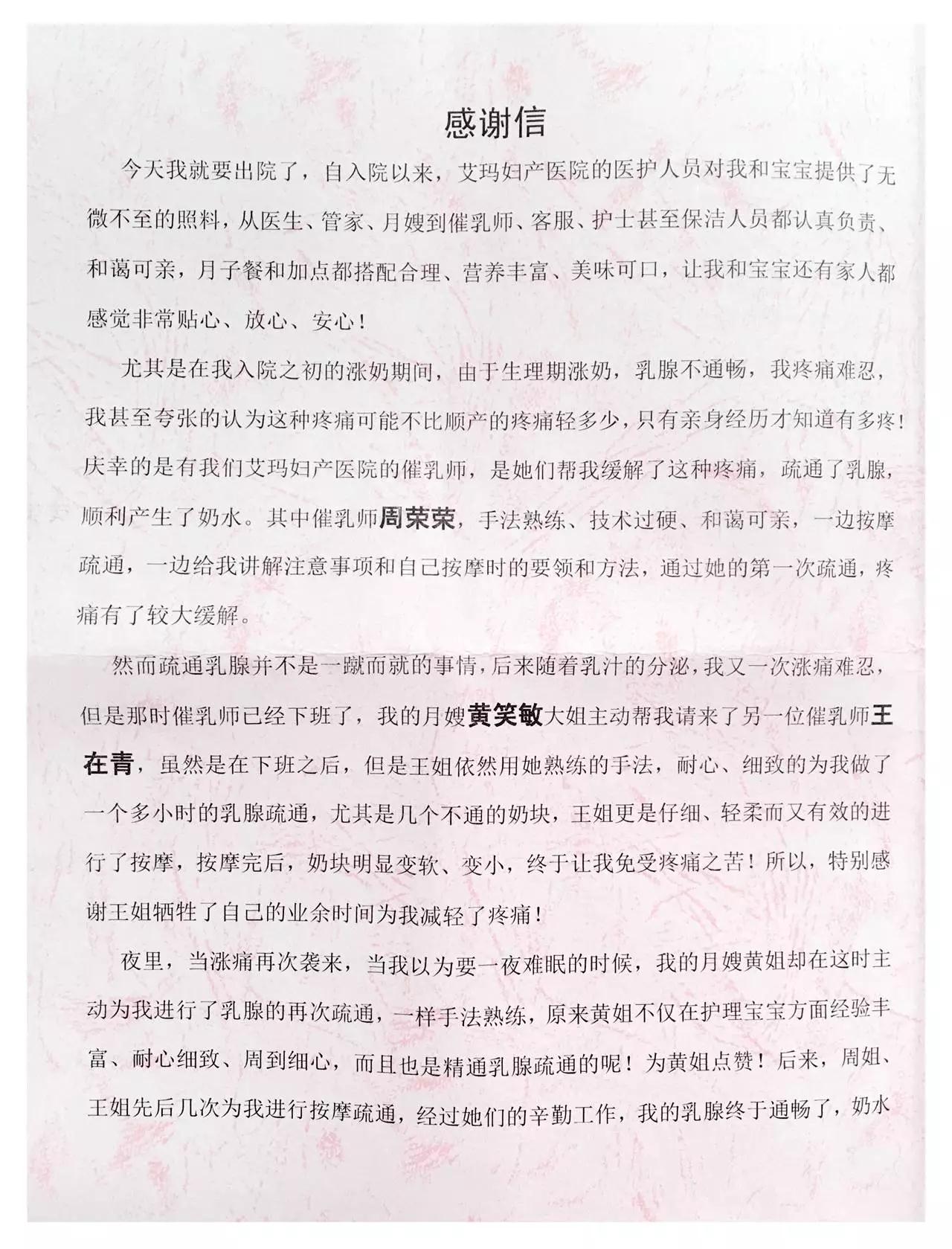 写这封感谢信的人,是位刚分娩的妈妈,周前,她选择来艾玛妇产“坐月子”,昨天出院之际,留下这封感谢信。