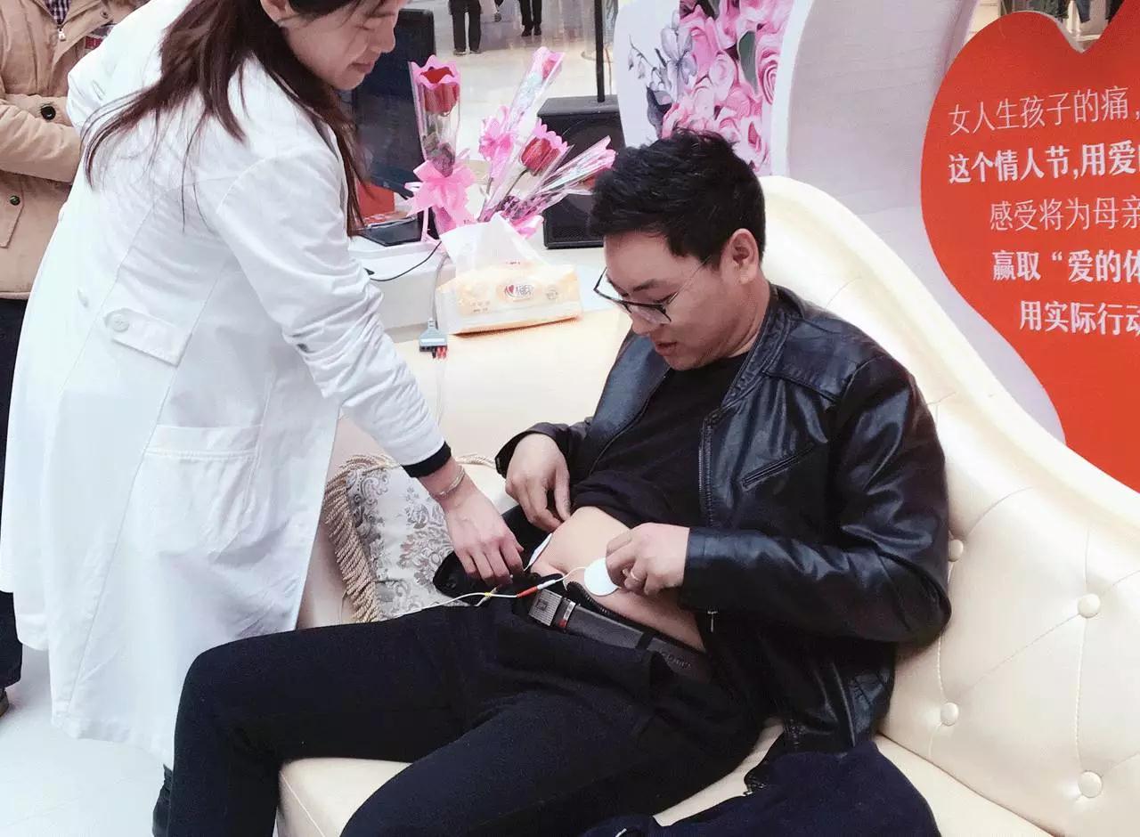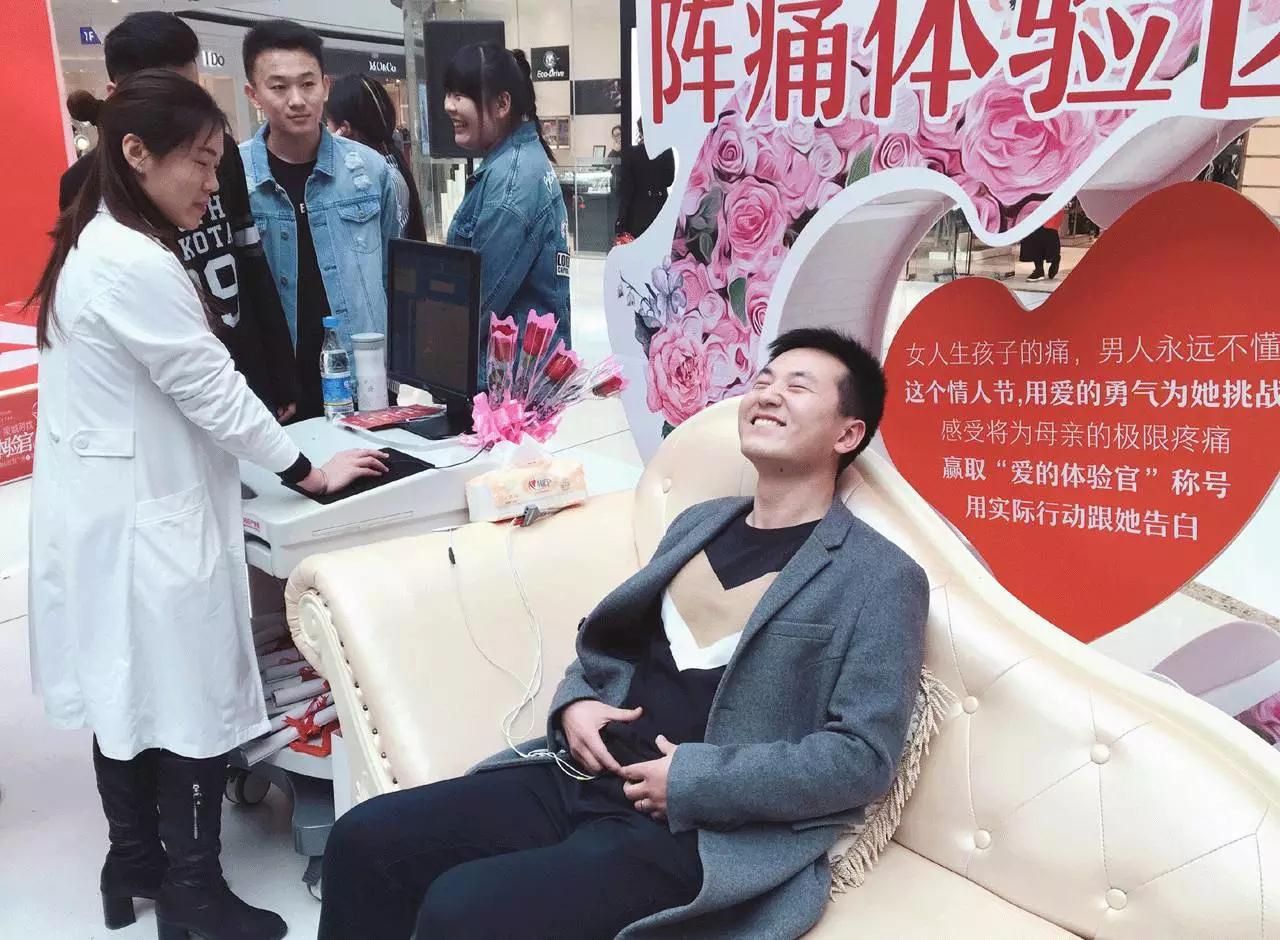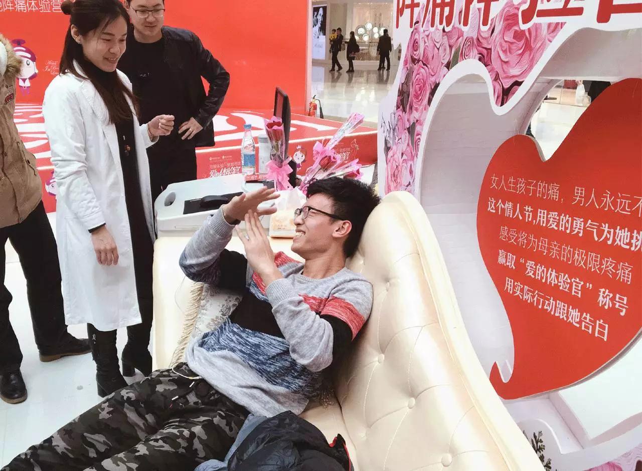 2月14日,在万达广场西厅,多名准爸爸体验了分娩阵痛,体会了女性在分娩时的痛苦感受。在1到10级的疼痛感受中,准爸爸们基本上到5级疼痛就纷纷受不了,停止了体验。而妈妈们分娩时的疼痛感,般都要达到10级。