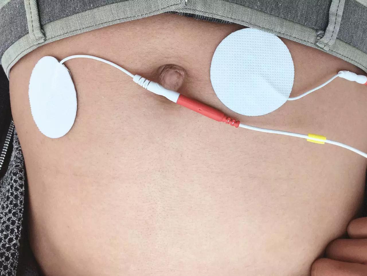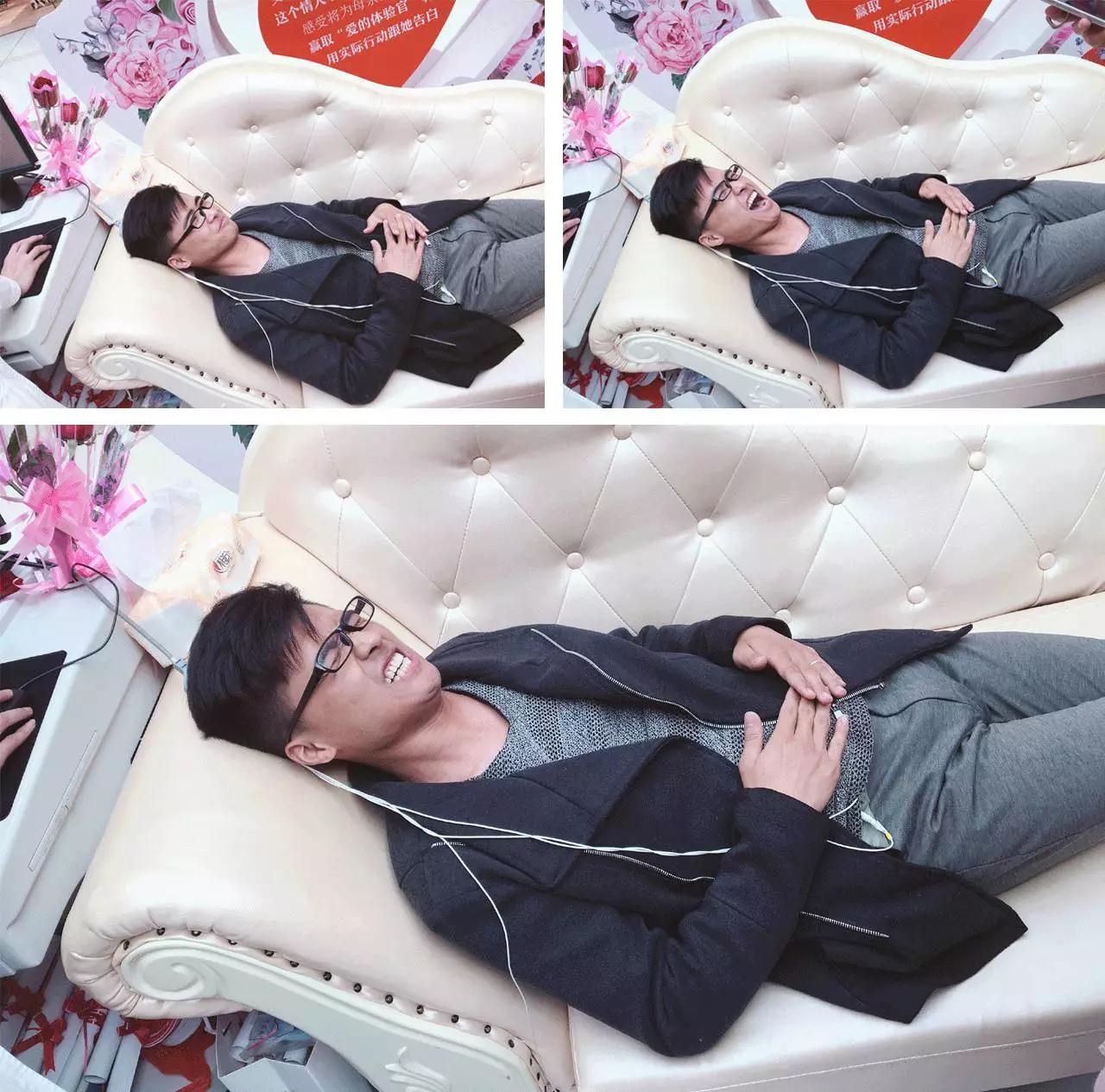 分娩阵痛体验是通过分娩阵痛模拟机,将电极片贴在体验者腹部,用电击刺激男性腹部使之收缩,同时模拟女性分娩时的疼痛,此次实验疼痛分10个级别,疼痛值从50到500逐级递增。