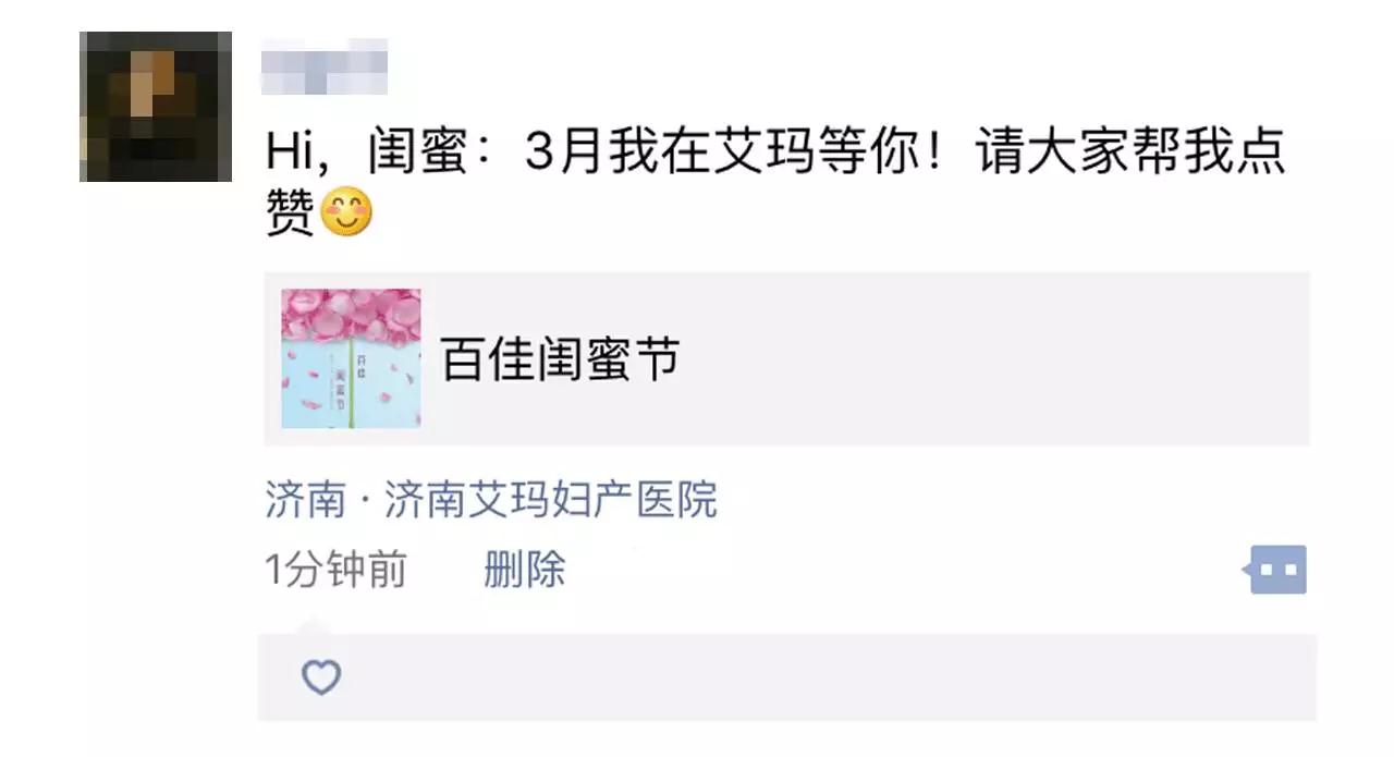 3月1日-31日期间,转发此条微信,并配上文字# Hi,闺蜜:3月我在艾玛等你!#分享至朋友圈,同时定位济南艾玛妇产医院,集满38个zan,并拉孕妈朋友入指定群,经群主审核,符合要求者,同获3.8元红包(红包有限,先到先得呦)。