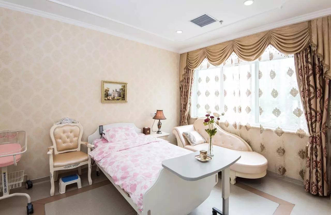 客厅再往里面走就是孕妇房了,空间很大,有一张舒适的孕妇床,有一个可移动的婴儿床,还有贵妃沙发,床的上面有吃饭用的小桌板,床的对面还有一个电视,风格真的挺居家的。本来生孩子是一件让人很紧张的事儿,但是来到这里却能够让人很放松。