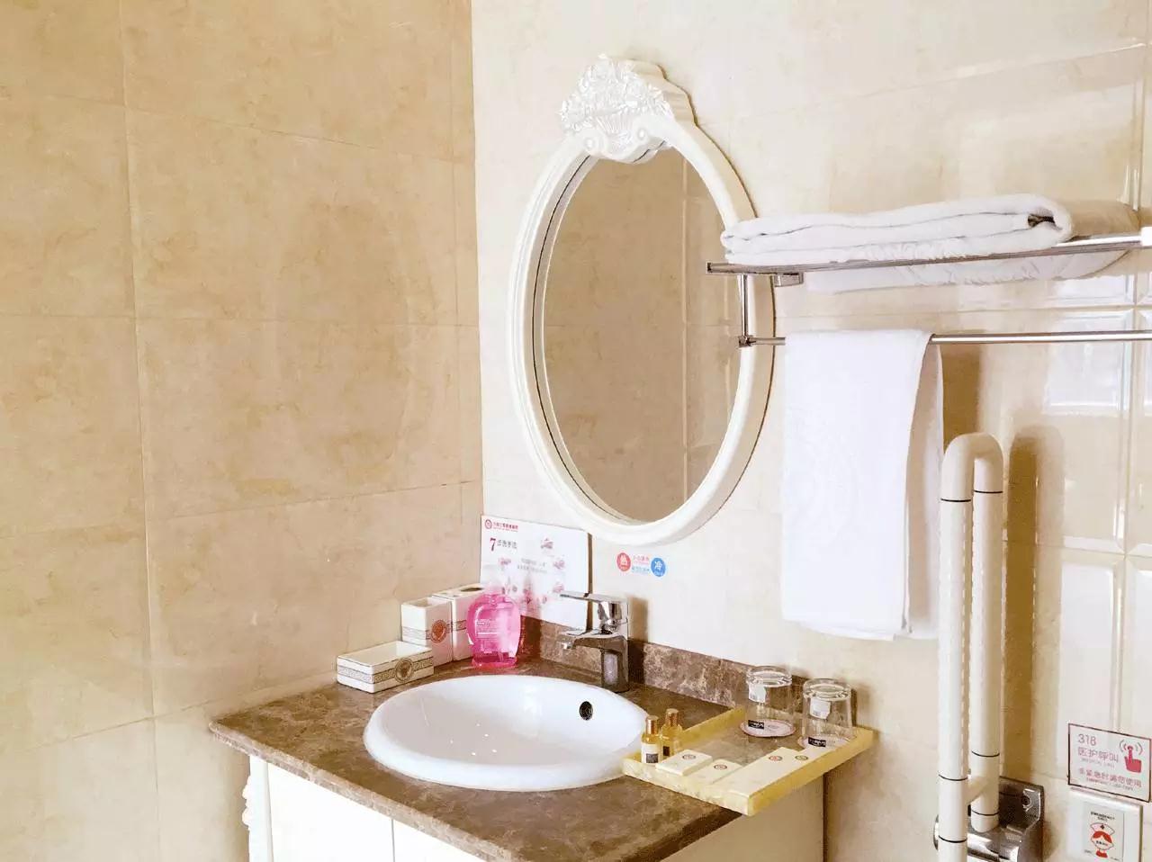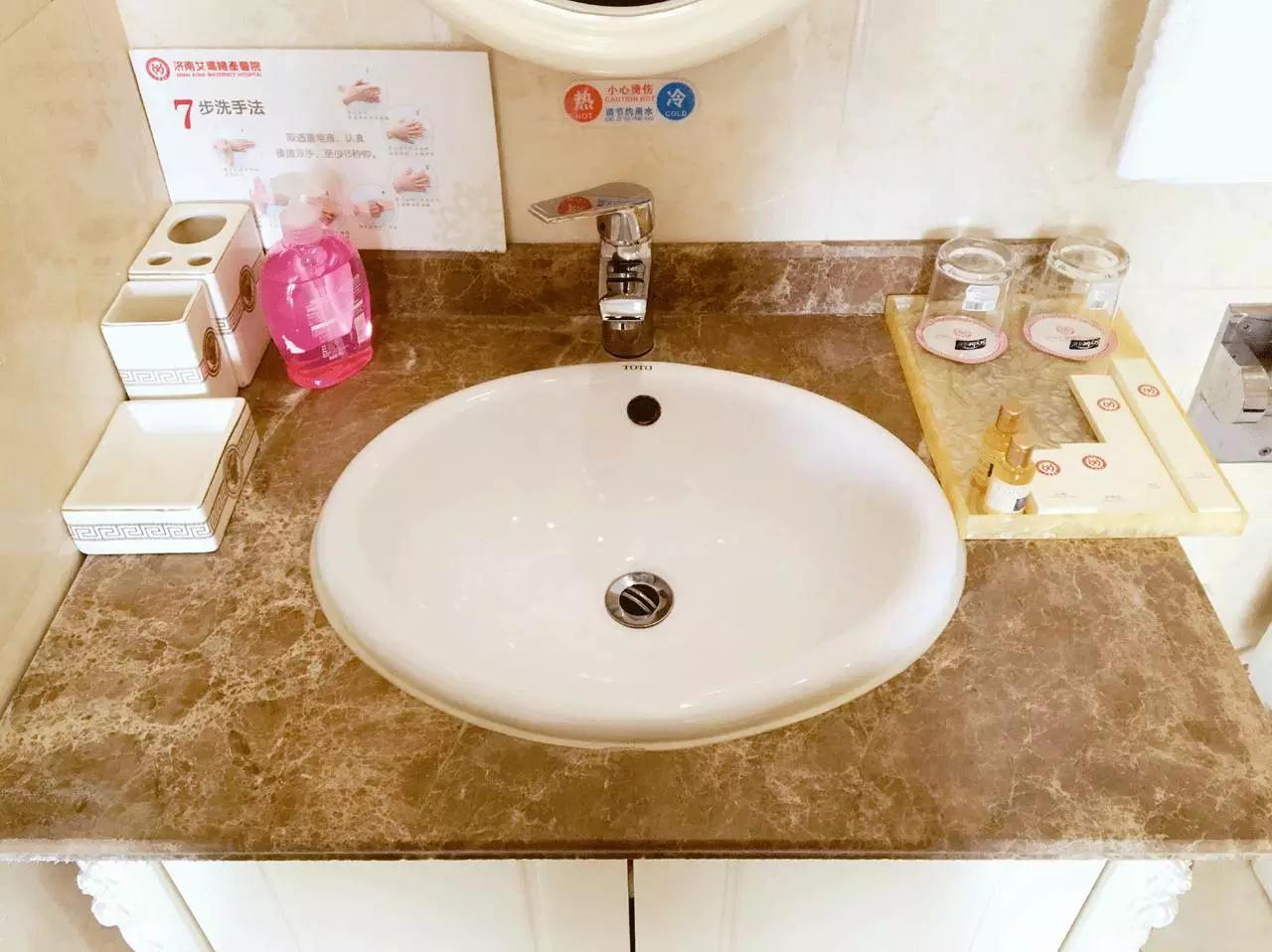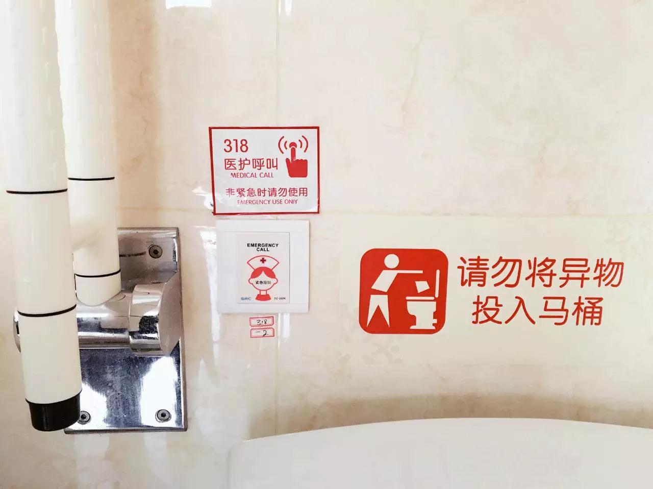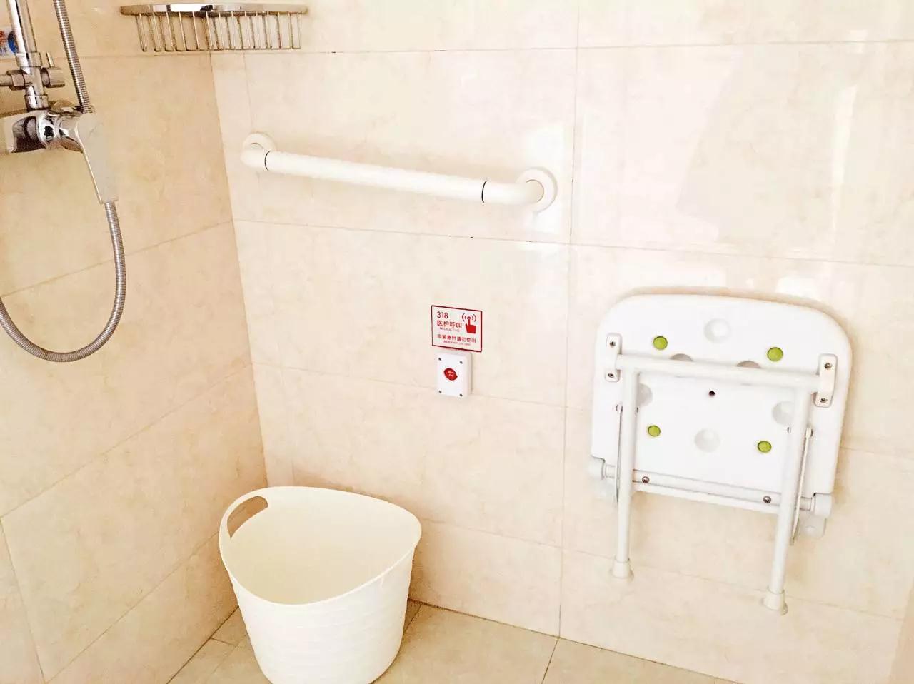 孕妇房的旁边有一个很大的卫生间,里面的洗手台干净整洁,淋浴间里面也有方便人坐着洗澡的折叠椅,马桶旁边还有一个呼叫按钮和一个起立扶手,处处想的都很周到。