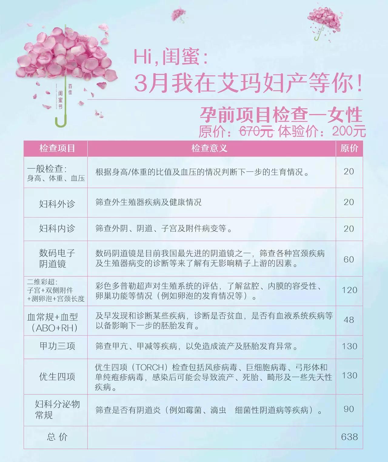 艾玛闺蜜节·女性体验季——艾玛妇产妇科检查优惠、备孕检查套餐优惠、心脏彩超、无创DNA优惠……等多重惊喜于3月16日-4月30日实力上线,为您献上一份春季女性“健康大礼”,别走开喔~
