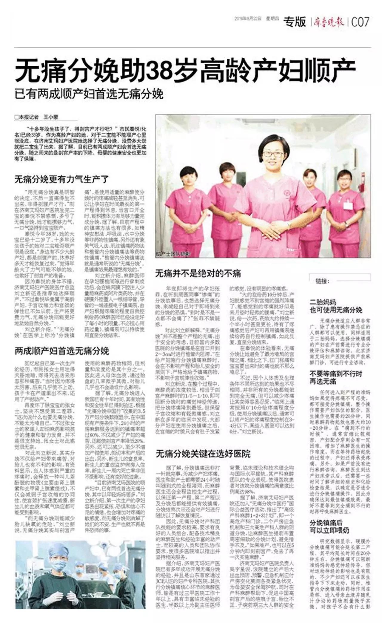 为了让更多孕妈妈享受到“无痛分娩”的服务,2016年6月,济南艾玛妇产医院与“无痛分娩中国行”签署了协议,成为其合作医院,共同推动“无痛分娩”新技术在泉城的应用推广。