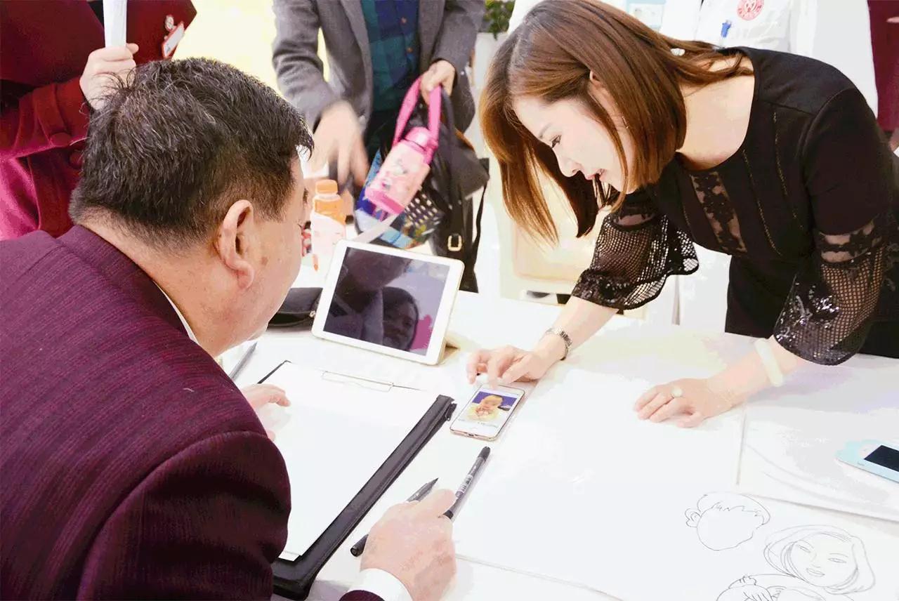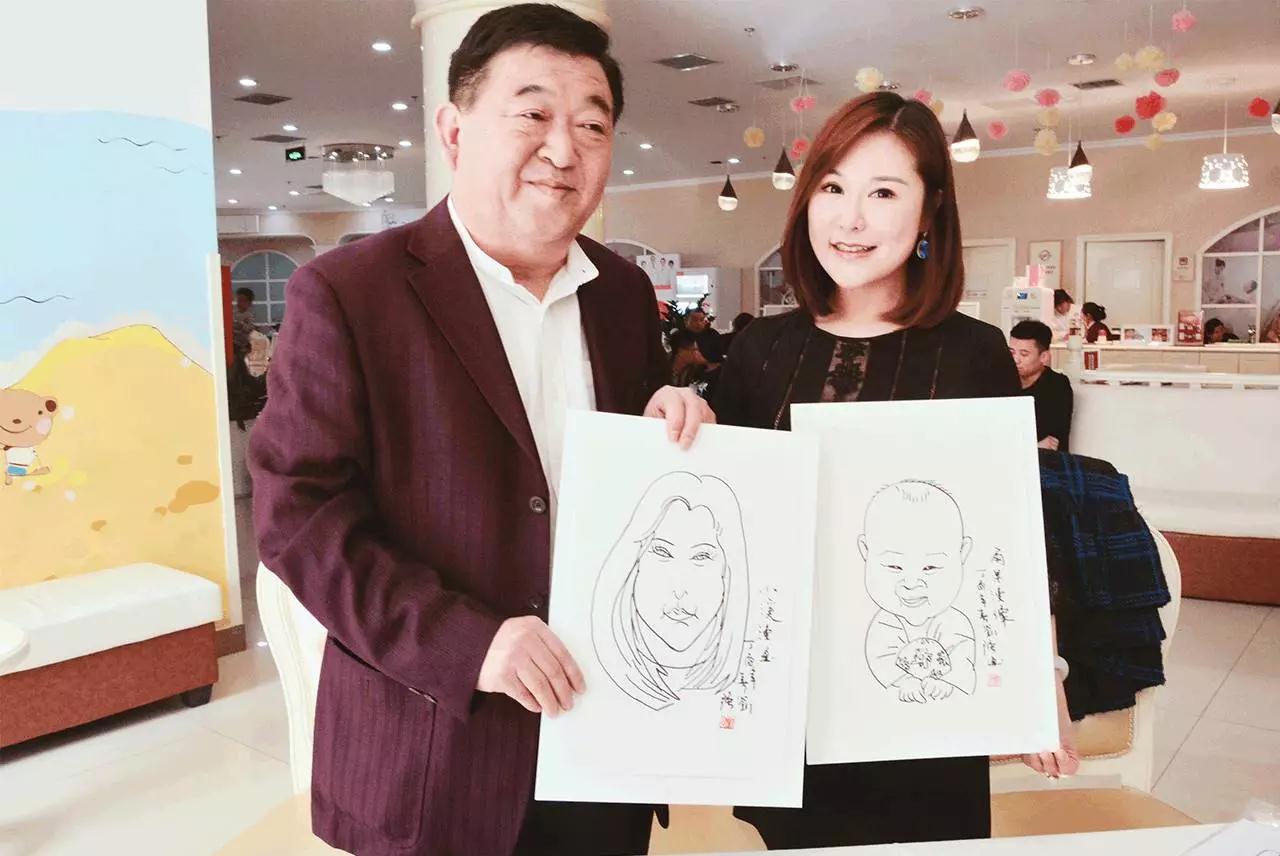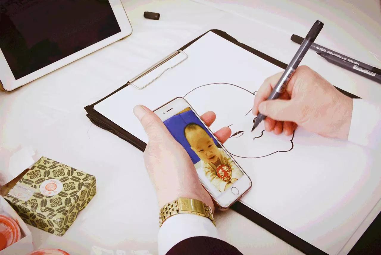 在另一个区域,卡通肖像画家正在作画,小溪把小雨果的生活照展示给画家,也来给宝宝定制一幅手绘肖像画~