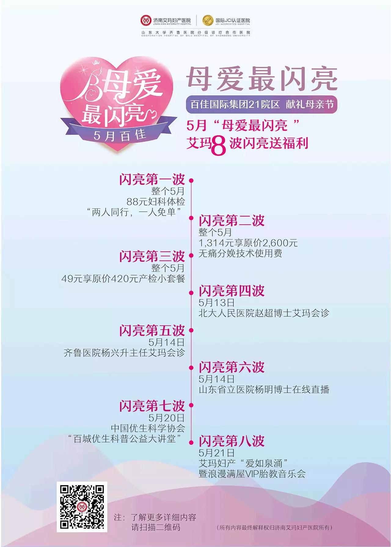 作为艾玛旗下第16家妇婴医疗专业连锁机构,山东首家JCI妇产专科医院,济南艾玛妇产医院推出了“母爱最闪亮,艾玛8波闪亮送福利”系列优惠和活动,回馈广大妈妈。
