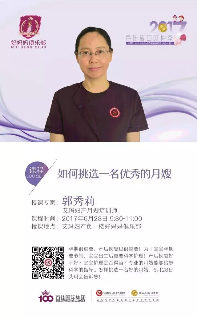 挑选月嫂,专业能力、经验固然重要,但她的人品、心态更重要,毕竟小宝宝没有足够的表达能力,弱小的他,对伤害毫无抵抗能力,而且,他是你重要的人。如何挑选名优秀月嫂,可真把宝妈们难住了。当然,优秀月嫂还是很多的。6月28日上午,来艾玛好妈妈俱乐部吧,这堂课《如何挑选名优秀的月嫂》送给宝爸宝妈们,艾玛妇产月嫂培训师郭秀莉亲自授课,现场传授好月嫂辨识宝典。
