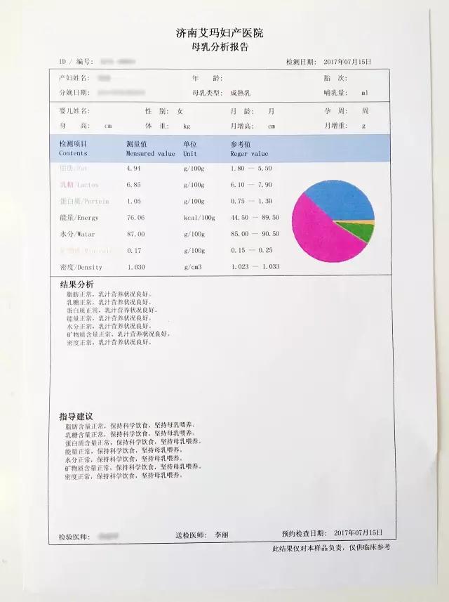 李丽医师仔细地看了报告,首先对宝妈叶女士坚持母乳喂养的做法给予了肯定。母乳营养检测的报告显示,叶女士母乳中各种成分含量都在正常范围,饮食结构不需要特别地去调整。