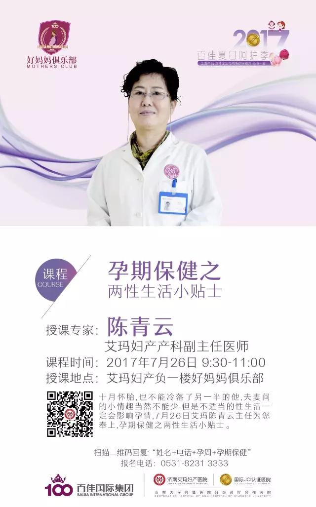 十月怀胎期间,夫妻间关系的维护也至关重要,即使是怀有身孕,夫妻间的小情趣还是要继续,但是孕期的性生活不能再像孕前那么任性,女性开始怀孕,就要重新安排夫妻间的性生活。孕期两性生活改如何进行?有哪些注意事项?什么时候需要停止?会不会影响到腹中的宝宝?本周三来艾玛好妈妈俱乐部,产科专家陈青云为您解读。还有现场指压板大挑战,赢取精美小礼品!宝爸宝妈还等什么,快快报名吧!