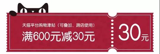 福利2:11月1日至11月11日期间,领取天猫平台发放的购物津贴,满600元再减30元,可叠加使用,可跨店使用!