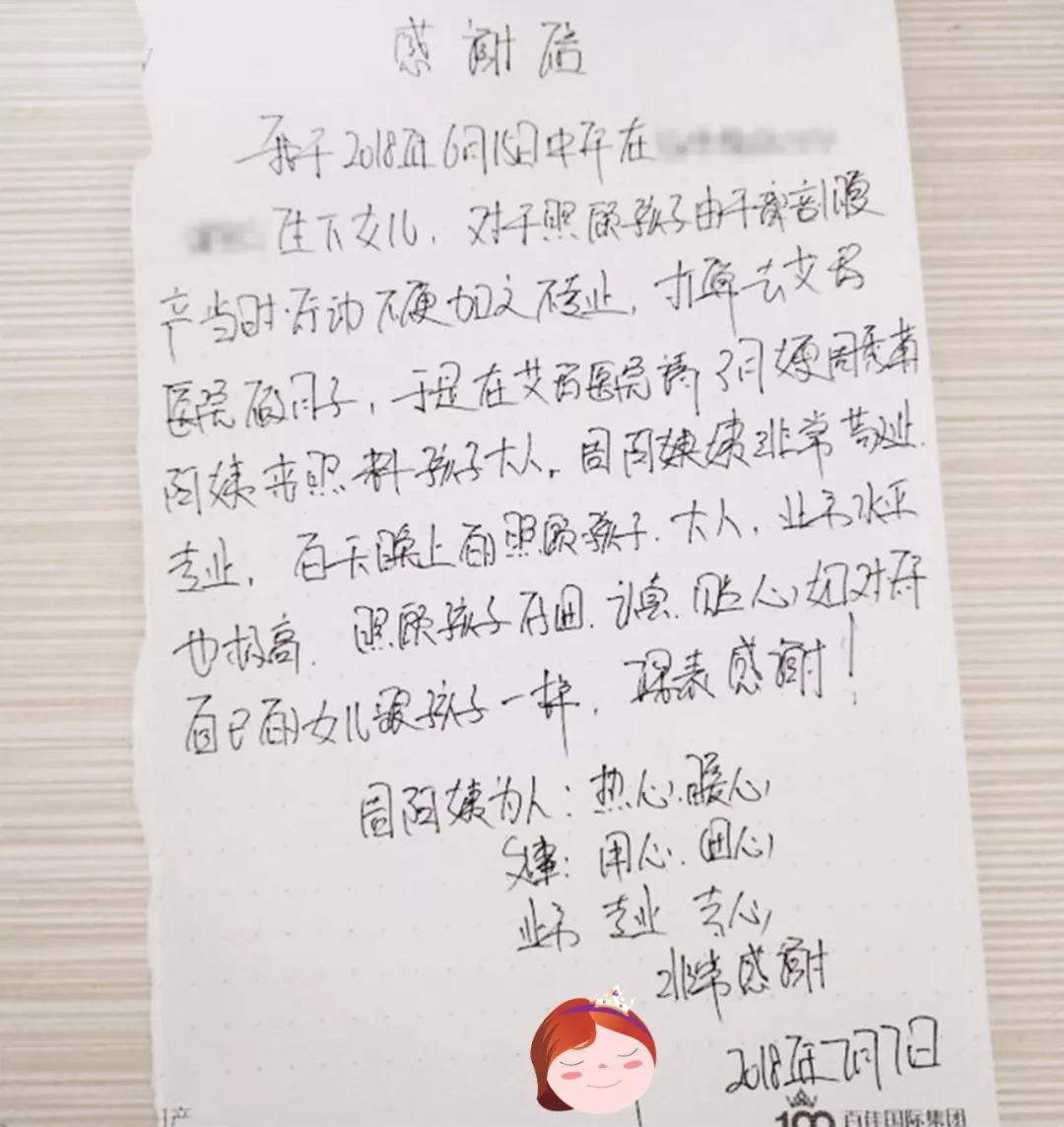 刘女士在朋友推荐下来到艾玛妇产坐月子,在坐月子的20多天里,医护人员对她无微不至的照顾令她满意和感动,特写下此信表示感谢。