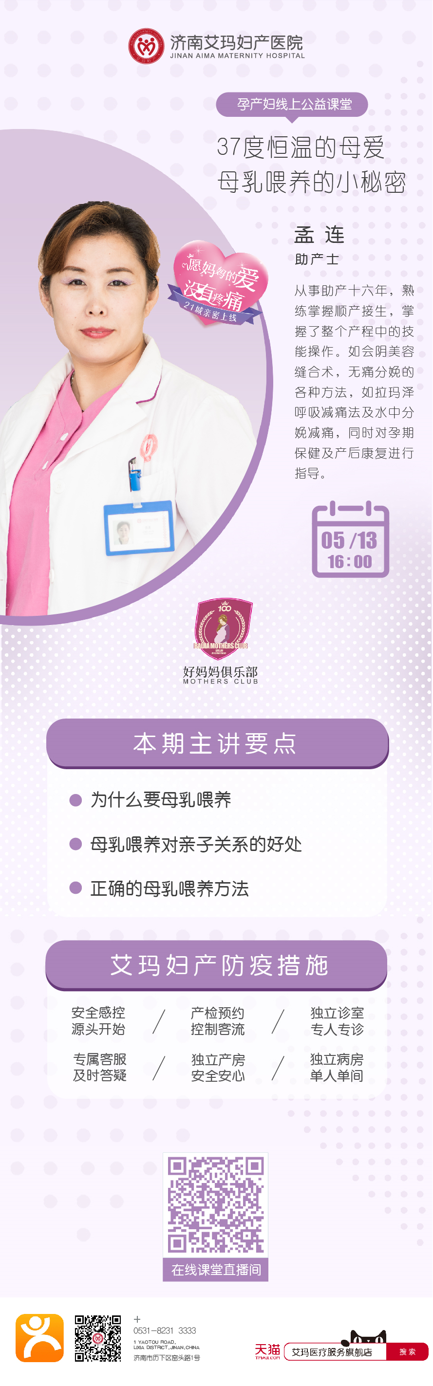 5月13日,艾玛助产士孟莲将为大家带来一场母乳喂养的课程,直播间与宝妈交流。母乳喂养不仅可以促进母亲产后的康复,同时能够促进亲子关系。讲解你不知道的秘密。