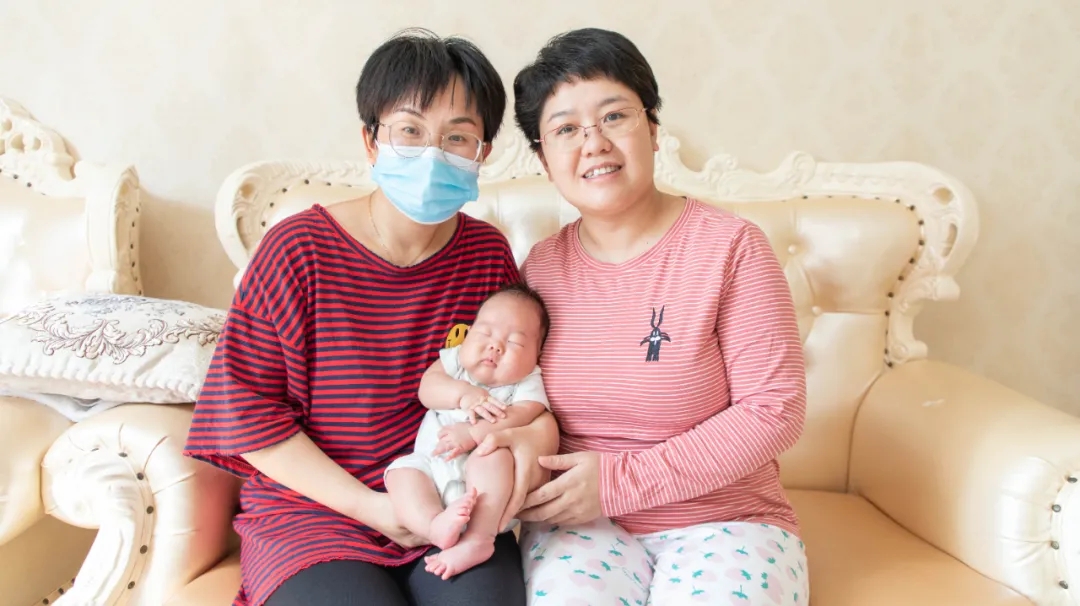 月嫂阿姨和宝宝合影留念,孩子虽然睡着了,嘴角竟也露出了甜甜的笑容