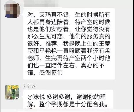 “艾玛真不错,生的时候所有人都在身边陪着,在待产室的时候也是他们安慰着,让你觉得没有那么生无可恋,他们的服务真的很好,推荐。我是晚上生的,王莹莹和马艳艳一直照顾着我,还有孟莲老师,生完在待产室两个小时,他们也一直陪伴左右,真心地不错,感谢你们!”