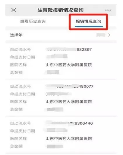 跳转到生育险报销情况查询界面后,再点击上方的【报销情况查询】按钮,即可查询到生育津贴的到账明细。