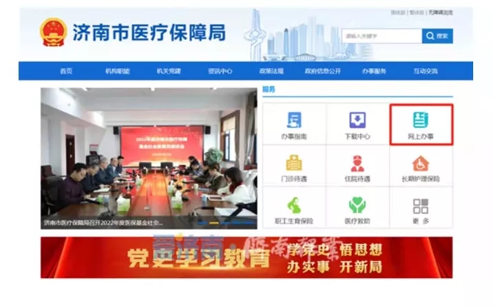 搜索并进入济南市医疗保障局官方网站,找到并点击【网上办事】版块;