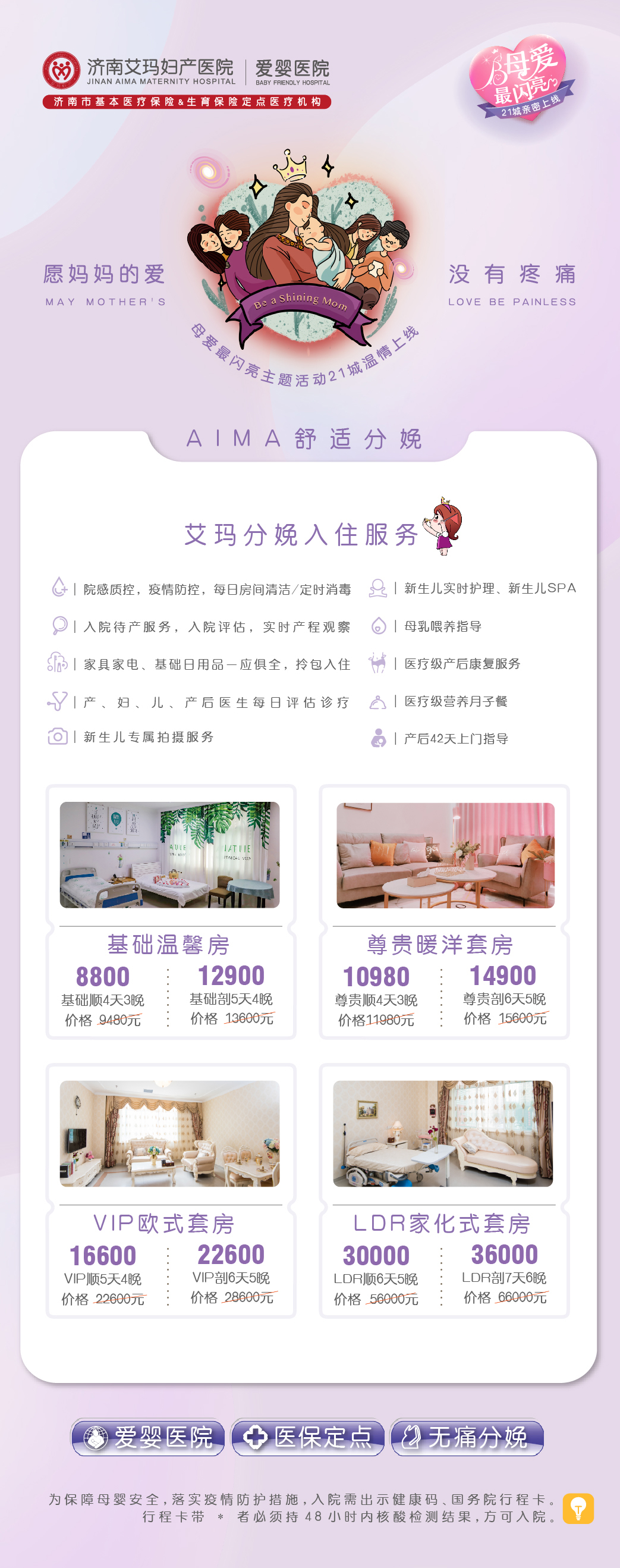 艾玛妇产舒适分娩采用家庭间模式,设有不同面积的套房。套房内独立卫浴、电视、冰箱、陪床以及母婴用品等一应俱全,从墙纸搭配到床垫软硬、从灯光柔和度到卫生间内扶手、急救铃、防撞等……每一细微处均用心布置,时刻贴心保护宝妈和宝宝。