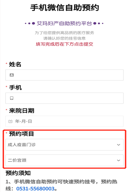 3、填写姓名电话和来院日期,在预约项目里选择“成人疫苗门诊”、以及需要预约的疫苗种类
